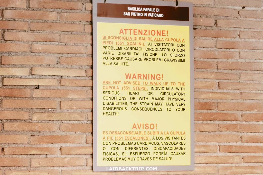 The whole climb to St. Peter's Dome and back took us about 80 minutes, not including the time needed to enter St. Peter's Basilica through the security check, which in our case was about 15 minutes. This total also does not include any waiting time for the stair climb, simply because there was no line. Had we taken the elevator option, however, it would definitely have added a few minutes to the overall time.