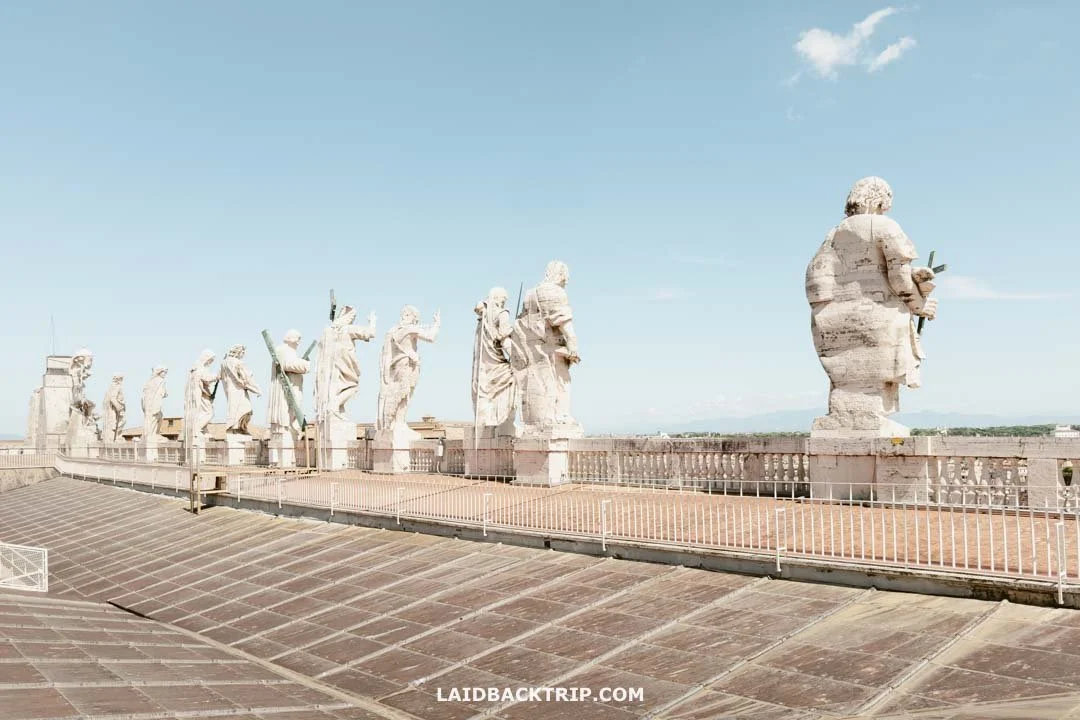 Once we stepped outside, we found ourselves on a lower terrace (technically a roof), an outdoor area connecting both staircases. We first turned right to examine the massive statues and enjoy one of the few views from this level. They were the same ones visible from St. Peter's Square on the basilica's front facade: the 13 statues of Jesus and the Apostles, each more than five meters tall. One interesting thing we noticed was that from behind, they lacked detail and looked rather plain.
