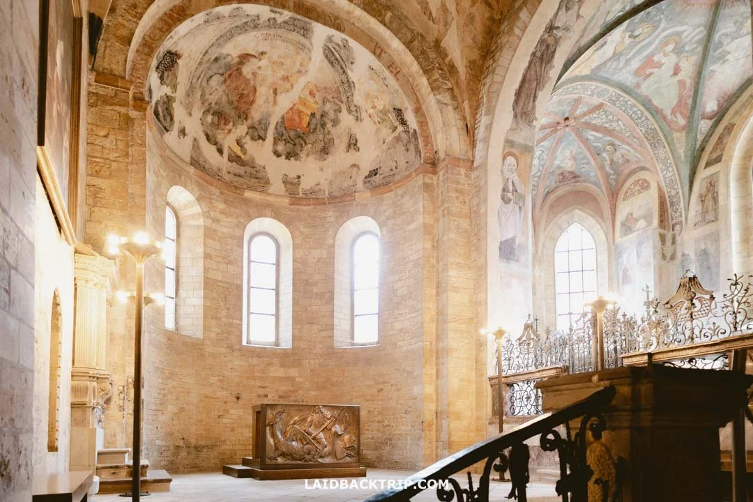 This would be our next stop. The basilica is much simpler and smaller than the cathedral and doesn't take long to see, but it's definitely not something we'd skip. Founded around 920, St. George's Basilica is the oldest surviving church building within Prague Castle and a beautiful example of Romanesque architecture. Behind its striking red Baroque facade lies a limestone interior containing the tombs of members of the Přemyslid dynasty.