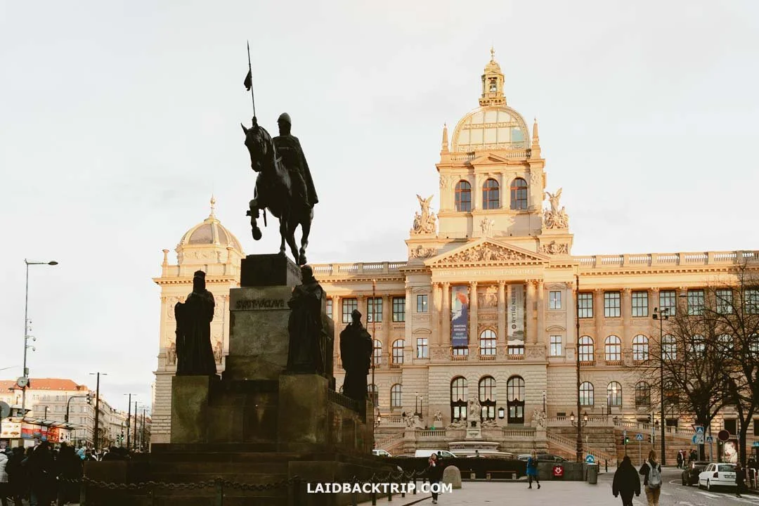 Unfortunately, we won't have time to explore the National Museum, which is a shame, because it has some really interesting exhibitions and stunning interiors. It opens at 10 AM anyway, so it would be closed at this hour. At least you can cross the road and climb the museum stairs to enjoy a great view of the whole square with the St. Wenceslas statue.