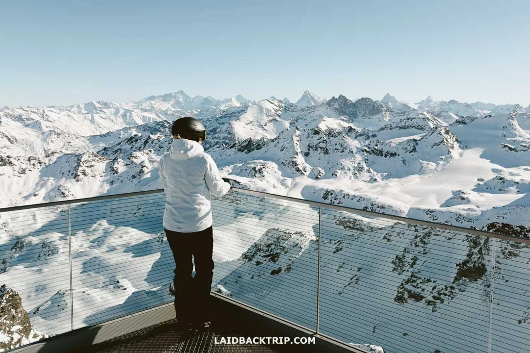 We both found that skiing at higher altitudes is more demanding and tiring, especially with all the steep slopes. While you could follow regular high-altitude skiing tips, like acclimatizing and saving the highest areas for day two or three, we didn't find it necessary. We could feel the altitude at almost 4000 meters, but since we didn't stay long and skied down rather quickly, it wasn't too bad. However, walking to the viewing platform at Klein Matterhorn in ski boots or climbing the stairs from the funicular at Mittelallalin with skis was definitely tougher.