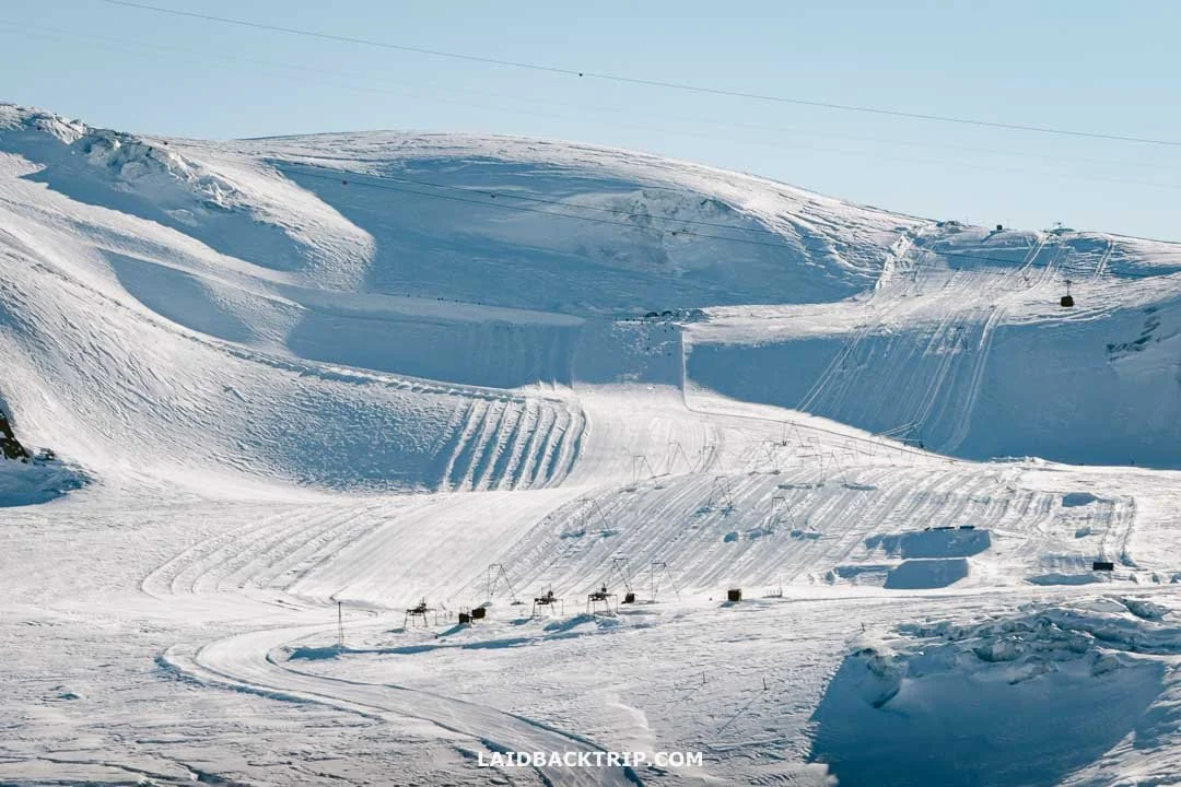 Firstly, summer is the hiking season for us. We love the warm, long days with tons of daylight. Secondly, the skiing area is much smaller in summer. In Zermatt, only 20 kilometers of slopes are available compared to the 360 kilometers during the main season. In Saas-Fee, ski racers take up the best parts of the slopes for training, reducing the area even more. Plus, skiing in July and August is limited to the morning since slopes usually close by noon. Snow quality is another concern - it's still summer, after all.