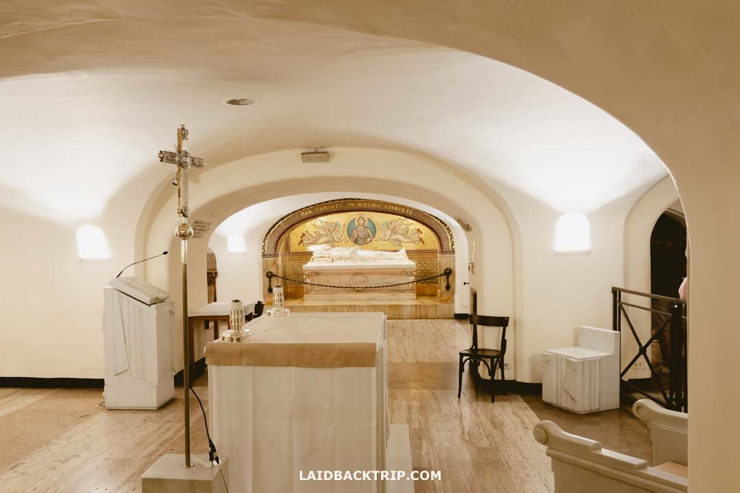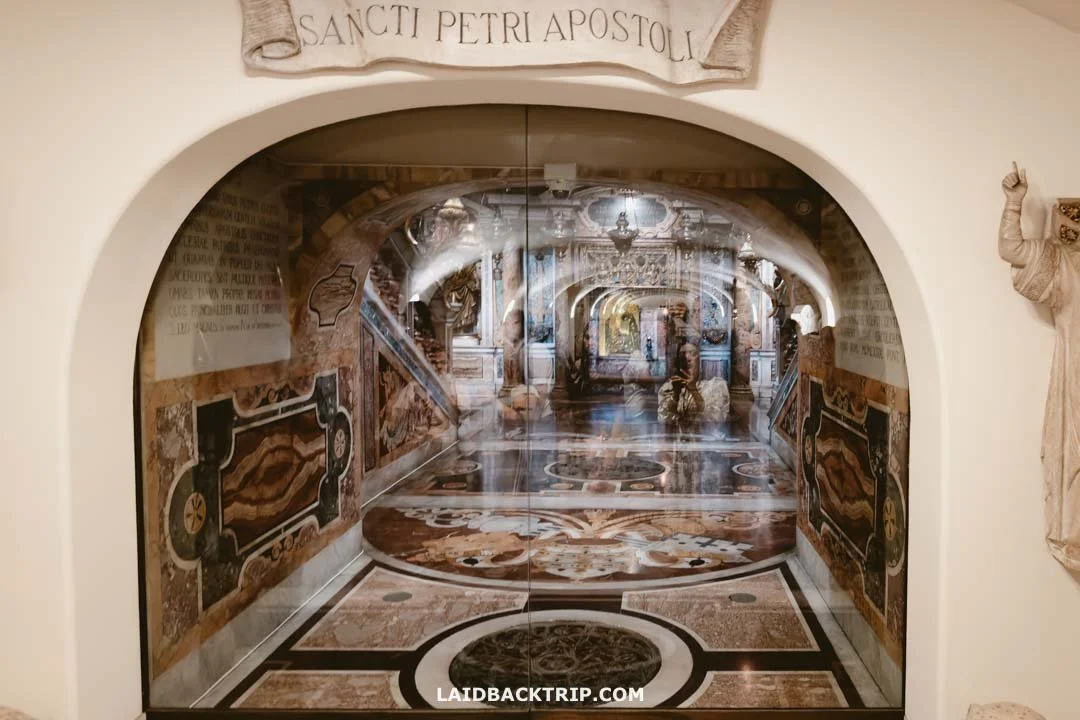 Once we reached the basilica, we walked straight ahead and entered the underground area known as the Papal Grottoes, sometimes simply referred to as the Vatican Grottoes. We accessed them from outside through a vault-like glass door, although there is also another entrance from within the basilica itself.