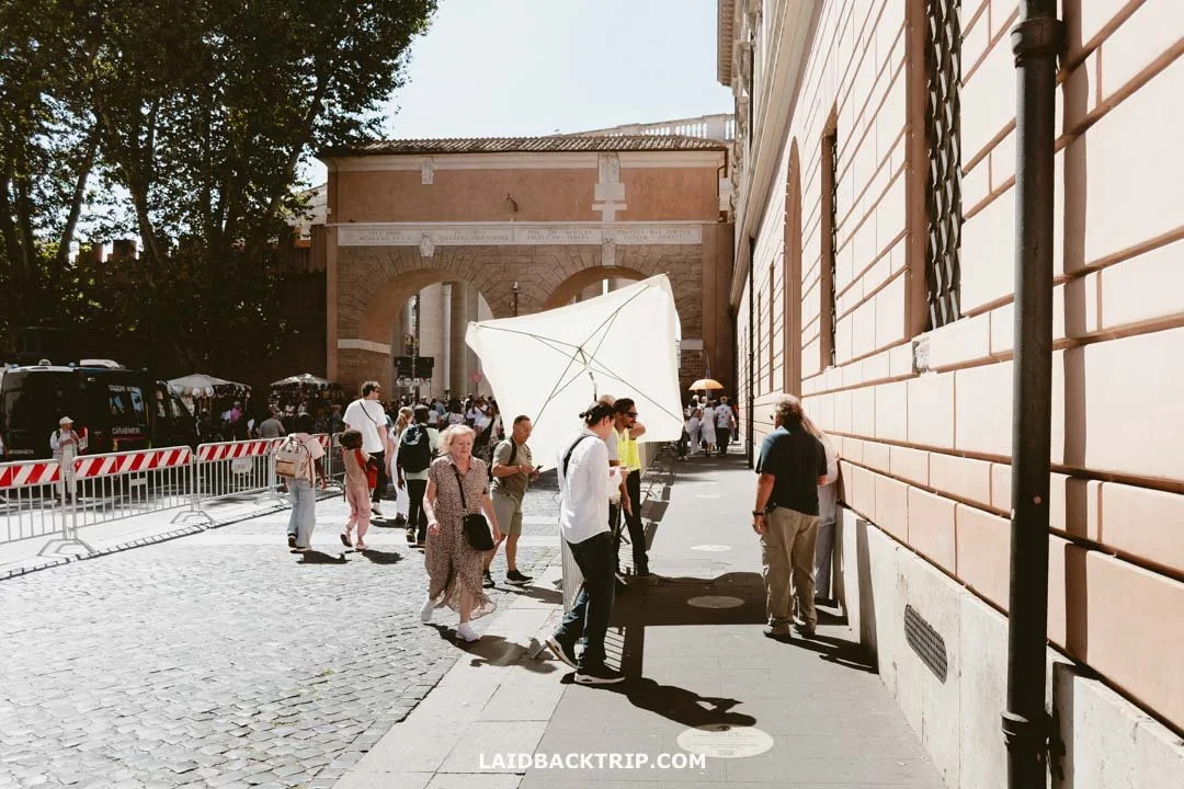 The access line technically began near the Vatican Walls at Porta Angelica, where Largo del Colonnato and Via di Porta Angelica meet. The exact GPS coordinates are 41.90343, 12.45761. Since we planned to visit the Vatican Museums first, we continued walking along the Vatican Walls until we reached their entrance.