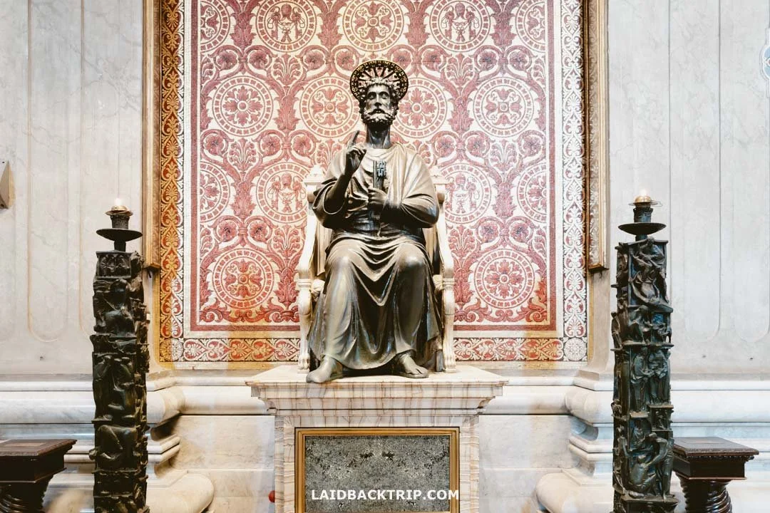 The old bronze statue of St. Peter has a worn‑down foot after centuries of pilgrims touching it.