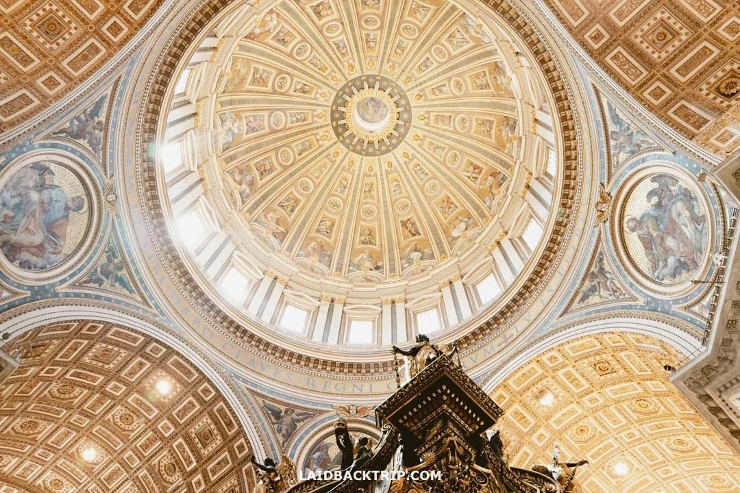 Directly above it, we could admire the tallest dome in the world. Its interior is richly decorated with massive mosaics, Latin inscriptions, and golden details. I personally loved the simplicity of the Pantheon's dome, which we also visited on this trip, but the sheer opulence of St. Peter's Dome is truly unmatched. Climbing the dome offers one of the best views in Rome, and it was one of those small adventures we simply could not skip. I will talk about that experience in more detail shortly.