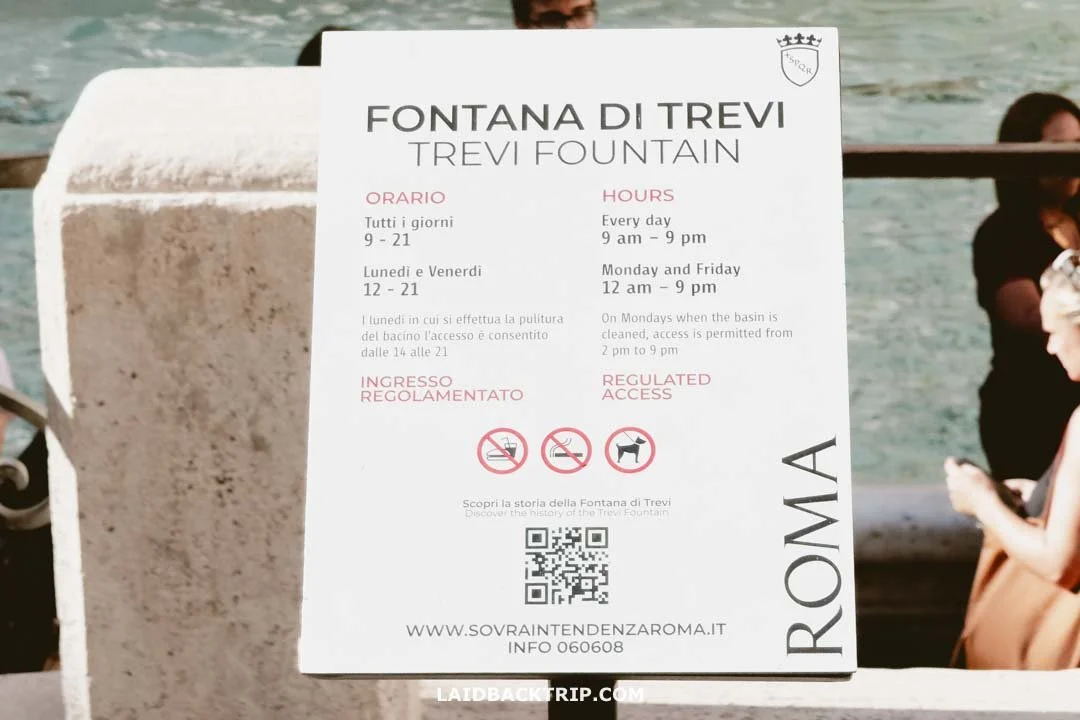 While we were waiting in line, we saw a small sign with the Trevi Fountain's hours. Technically, the whole square with the fountain is open 24/7 and doesn't have official opening or closing times, but the entry lines for people going down to the basin do have specific hours.