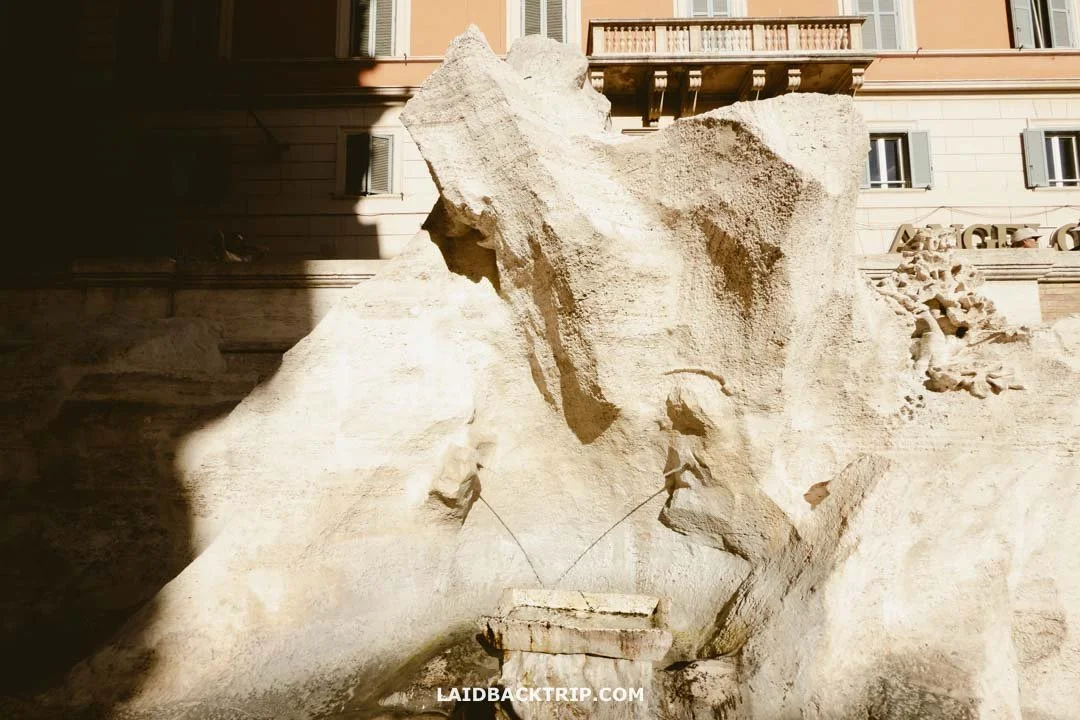 The fountain sits right on a small square in Rome's center, surrounded by buildings. The whole square is public, so anyone can visit, no matter the time of day or night.