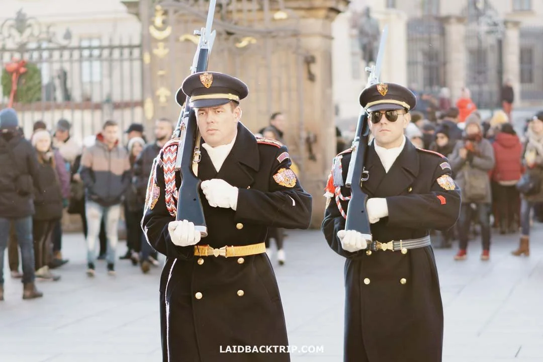 Before we leave Hradčanské Square, we can stay here a bit longer and enjoy the famous changing of the guards. It's one of those small rituals that gives the Prague Castle a bit of a ceremonial feel (and definitely adds it to your visit). The guards belong to the Castle Guard, an elite unit that protects the president, and you'll see them rotate every hour at the main gates.