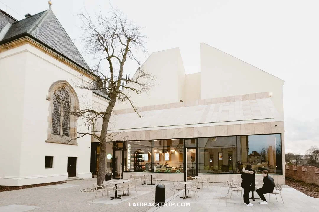 Inside Prague Castle, there's the traditional Vikárka Restaurant and Bistro U Kanovníků right by St. Vitus Cathedral and Restaurant Lví dvůr, just a few steps from the Pražský hrad stop. And from what we've seen, the food is nothing special, but the prices certainly are. Then there are a few cafes of varying quality (some look nice, some look like classic tourist traps) and also a couple of Starbucks (one on Hradčanské náměstí and one in a courtyard entered from Náměstí u Sv. Jiří). Prague Castle is also one of the places where Christmas Markets are held, and I've already written a post about them, and if you want the short version, I'm not a fan.